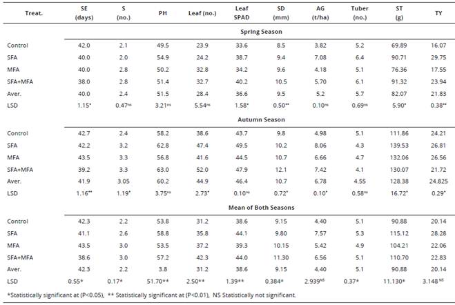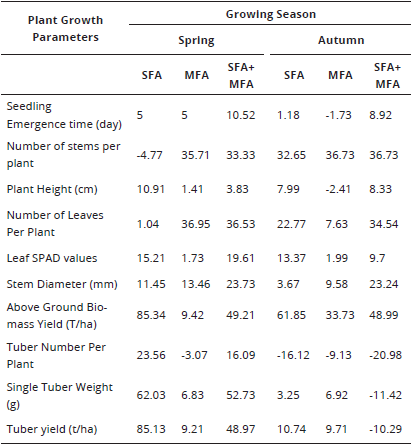 Tuber yields ranged between 16.07t/ha and 29.75 t/ha depending on season and treatments (Table 3). Control plots always produced the lowest tuber yields (Table 3, 4). In spring sowing, SFA plots produced the highest tuber yields (29.75 t/ha) followed by SFA+MFA (23.94 t/ha) and MFA (l7.55 t/ha) plots. SFA+mFa treatment yields (23.94 t/ha) were even lower than SFA plots (29.75 t/ha). In autumn sowing, SFA (26.81 t/ ha) and MFA (26.56 t/ha) yields were higher than control (24.21 t/ha) and SFA+MFA (21.27 t/ ha). SFA+MFA plots produced lower yields than control plots. On average of both seasons, MFA applied plots produced 22.06 t/ha tuber yield compared with control (20.14 t/ha) and SFA plots (28.28 t/ha). SFA+MFA plots produced even lower tuber yields (22.83 t/ha) than SFA plots. MFA applied plots produced more tuber yields by1.48 t/hain spring, 2.35 t/hain autumnand by 1.92 t/ha on average of both seasons when compared with control plots (Table 3).