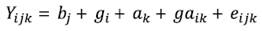 [Eq. 1]where, bj = effect of block j; gi = effect of progeny i; ak = effect of storage k; gaik = effect of the interaction between progeny and storage ik; eijk = experimental error. The degrees of freedom of the effects of the factors as well as the interaction were unfolded via regression analysis, considering a coefficient of determination of the models above 60%. When this value was not obtained, the means were compared via Tukey test at 5% probability with the aid of the Assistat program, version 7.7 Beta (Silva, 2014).