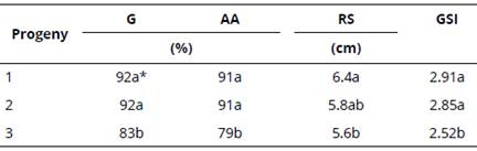 Progenies 1 and 2 provided better responses for G and in vigor evaluation tests AA, RS and GSI, during storage (Table 3). Carvalho and Nakagawa (2012) refer to the longevity of the seeds, which is mainly characterized by the period in which they can live according to their genetic traits, showing the presence of genetic variability for these attributes. These traits were not included in the selection indices developed over the cycles for the selection of the best progenies, but the intrapopulation recurrent selection was effective (Silva and Viana, 2014).