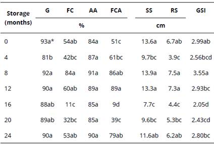 In the first two months of storage, Lima et al. (2010) observed an increased germination percentage, for the first germination count and seed germination speed index for passion fruits purchased from the market. From that period on, a decreased germination was observed, until reaching the six months of storage. They concluded that the seeds presented postharvest dormancy, which was broken after 30 days of storage. In this study, no changes were observed in the germinating potential for the AA stress resistance test, which remained uniform throughout the 24 months of storage (Table 4).