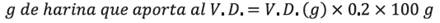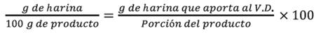 Las formulaciones de los productos con base en las harinas resultantes fueron establecidas de acuerdo con el valor de referencia para productos con contenidos de nutrientes ‘alto’ y ‘buena fuente’, para el efecto se utilizaron porciones de 5 - 10 g para proteína y de 500 - 1000 UI para vitamina A como niveles adecuados para niños mayores de 4 años y para adultos, según lo establecido por la Resolución 333 de 2011 (Ministerio de la Protección Social, 2011). El aporte de harina de ahuyama se ajustó con base en la pérdida estimada y corregida según un factor de pérdida definido y establecido por De Moura F. (2015). El aporte de las harinas se calculó según la Ecuación 1, 2 y 3, de la siguiente manera: