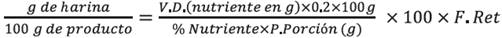 (Ec. 3)donde, V.D. = valor de referencia (Ministerio de Salud y Protección Social, 2015); %Nutriente = cantidad de nutriente aportado por 100 g; P. = porción: peso de la porción en gramos; F.Ret. = factor de retención de vitamina A 30%