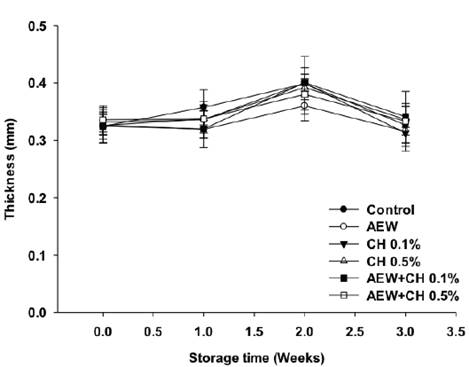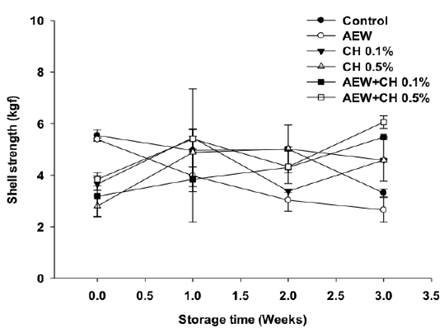 The effect of the antimicrobial treatments on shell thickness and strength are shown in Figures 1 and 2. Shell thickness and strength are important to preserve moisture loss, mechanical protection, as well as to prevent microbial invasion during handling. A significant change was observed with the application of AEW on shell strength and thickness (P < 0.05) compared to control (Figures 1 and 2). The eggshell is constituted of shell membranes and cuticle layers (Rodríguez- Navarro et al., 2013). Previously, Bialka et al. (2004) reported a partial elimination of the cuticle layer on eggs treated with AEW, however this affectation was not significant to affect the shell strength. The presence of cuticle enhances the mechanical strength of eggshell (Liu et al., 2016). The damage on cuticle can expose the pores and facilitate crack formation, as evidenced by SEM (Figure 3b). The results on eggshell quality also suggest, that the application of AEW by ultrasonic nebulization have a major impact on cuticle damage in compare to its application by immersion, probably the fine mist formed (droplet size 5 ^m) had a major surface contact extending the damage on cuticle. Thickness of eggs treated with CH alone or in combination with AEW was similar to control, conversely a significant eggshell strength (P < 0.05) was observed on eggs treated with AEW + CH 0.5%. This could be due to the presence of chitosan coatings, as evidenced by SEM (Figure 3f). In agreement with these results, Suresh et al. (2015) reported an increase on eggs shell strength by the application of CH.