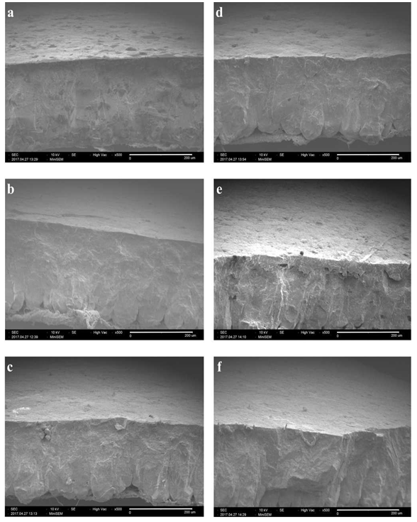 The eggshell of control eggs showed a surface porosity (Figure 3a). In contrast, eggshells treated with CH alone or in combination with AEW, the pores were covered by a coating as well as a smoother surface compared to control eggshell was observed (Figures 3c-f). Similar observations have been reported (Suresh et al., 2015). A different morphology in cross-section was observed with all the treatments compared to control. A change in internal morphology by the application of biopolymers as coatings has been previously reported by Xu et al. (2016). Figure 3b show the morphology of eggshell treated with AEW, from which obvious cracks could be seen.