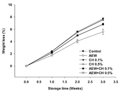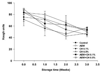According to Mueller (1959) the albumen quality can be lost mainly to the movement of water from albumen to yolk. Significant differences (P < 0.05) were exhibited between control eggs and eggs treated with CH alone after 3 weeks of storage. The concentration of CH plays an important role on maintain the albumen quality, this could be due to the thickness of the coatings as evidenced on avoid water loss and SEM observations. This means that eggs treated with CH 0.5% (69.7) could preserve the albumen quality for at least three weeks compared to control eggs (61.2), as previously Kim et al. (2009) and Suresh et al. (2015) reported.