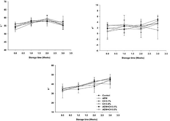 The pigment in egg yolk determines the acceptability of the product by the consumer who prefers yellow-orange egg yolk. Yolk colour is mainly due to the content of yolk carotenoids, which can be degraded by oxidative processes, changing the yolk pigmentation during storage and processing (Nimalaratne et al., 2016). No significant changes were observed on L* values in all treatments (Figure 5). Eggs treated with the combination of AEW + CH 0.1% a significant increase (P < 0.05) on a* and b* values were observed. Conversely, a decrease on these values was obtained with the sole application of CH compared to control. The use of CH seems to play an important role in maintain the pigmentation of egg yolk, as previously Bhale et al. (2003) reported.