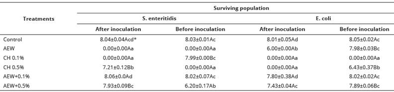 The results of the efficacy of treatments are shown in Table 1. For eggs inoculated with S. enteritidis, significant differences (P < 0.05) were found among the treatments on microbial inactivation. AEW was effective on totally reduce S. enteritidis after and before inoculation. Conversely, eggs inoculated with E. coli and treated with AEW only 2 log CFU/egg (after inoculation) were reduced. Only CH at low concentration (0.1%) was effective to completely inactivate E. coli on eggshell. The bactericidal effect of AEW is attributed to its low pH (2.1-4.5), high oxidation-reduction potential (higher than 1000 mV) and the presence of active oxidizers (Liao et al., 2007). Several mechanisms of action have been proposed for AEW including damage of membranes, decarboxylation of amino acids, reactions with nucleic acids and oxidation of enzymes (Hricova et al., 2008; Pinto et al., 2015; Ramos et al., 2013). Several studies have been reported the effectiveness of AEW on contaminated eggs by S. enteritidis and E. coli (Cao et al., 2009; Cui et al., 2009; Ni et al., 2014). The antibacterial activity of CH on Gram-negative occurs with the electrostatic interaction between the polycationic structure of CH and the anionic components (phosphate, carboxyl) (Cao et al., 2009) of the microorganism’s surface (on lipopolysaccharides) leading the destabilization and function of the outer membrane of microorganism, affecting its permeability with the leakage of the cell constituents, and cell death (Kong et al., 2010). The use of CH as coatings, in order to control microbial spoilage has been reported with good results (Jin et al., 2013; Legendre et al., 2015; Saeed et al., 2017; Suresh et al., 2015). The combination of sanitizing agents is regularly used to increase the efficacy of disinfectant against pathogenic microorganism (Joshi et al., 2013); however, the combination of AEW and CH reduced the bactericidal activity against the pathogens tested. Bactericidal efficacy of CH depends of various factor s like: (1) microbial factors (related to microorganisms); (2) intrinsic factors of CH (concentration, molecular weight, positive charge density); (3) physical state of CH (water-soluble or solid state); (4) environmental factors (pH, temperature and reactive time) (Kong et al., 2010). According to our results, the fog as physical state plays an important role on its efficacy. On the other hand, Hricova et al. (2008) reported that AEW antibacterial efficacy can be reduced when the sanitizer is in contact with organic materials like CH, as evidenced in this study.