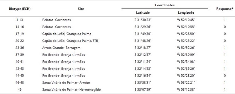 The authors are grateful to the Department of Botany at the Federal University of Pelotas, for assistance in taxonomical identification of Echinochloa crusgalli biotypes.