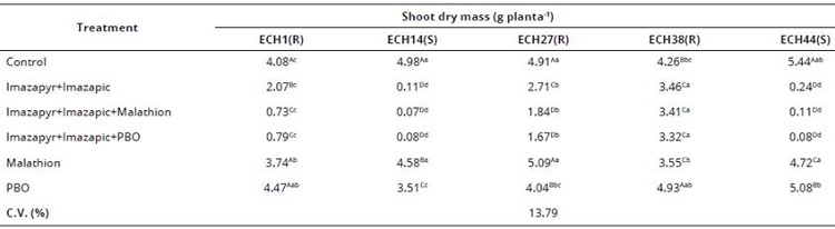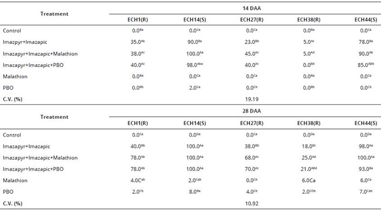 In summary, two (ECH1 and ECH27) of the three biotypes resistant to the herbicides imazapyr + imazapic have shown resistance possibly due to enhanced metabolism. Similar results were found for E. phyllopogon, where the application of malathion followed by application of bispyribac-sodium to resistant plants, resulted in a decrease in shoot dry mass of up to 31% beyond the obtained without malathion, suggesting enhanced metabolic herbicide degradation contributed to this weed specie resistance to herbicides (Fischer et al., 2000).