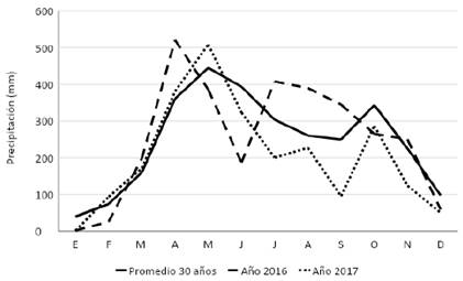 El experimento se desarrolló en Centro de Investigación La Libertad, de la Corporación Colombiana de Investigación Agropecuaria (Agrosavia), ubicado en el municipio de Villavicencio, departamento del Meta, Colombia, a 4°03.500’ de latitud norte y 73°28.152’ de longitud oeste. La precipitación promedio anual, es de 2900 mm, con un periodo seco desde diciembre hasta finales de marzo. La temperatura promedio es de 26 °C y la humedad relativa de 85% en la época lluviosa y 65% en la época seca. El experimento se realizó entre julio de 2016 y junio de 2017. En la Figura 1 se presenta la precipitación en este periodo con respecto al registro de 30 años.