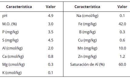 En el sitio experimental predominan Oxisoles de terraza alta con buen drenaje, franco arcillosos, caracterizados por su acidez, con saturación de aluminio de 60%. Los nutrientes más deficientes son fósforo (3.5 mg/kg), azufre (4.5 mg/kg), calcio (0.8 Cmol/kg) y magnesio (0.3 Cmol/kg) (Tabla 1).