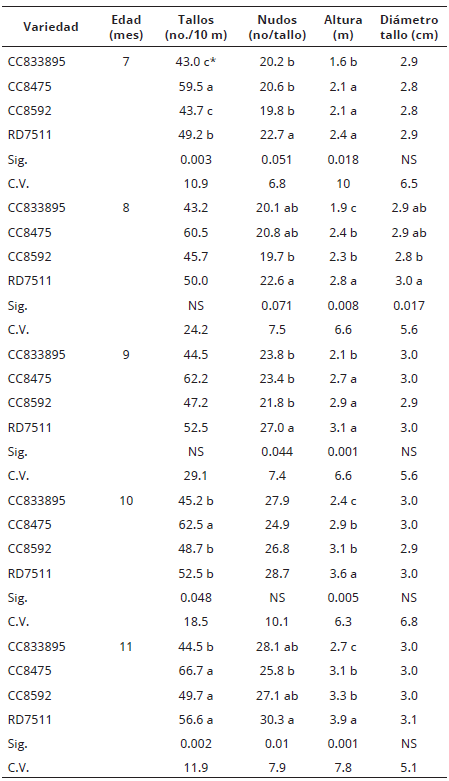A las edades de 7 y 10 meses, la variedad CC8475 presentó el mayor número de tallos/planta (P < 0.05). A los 11 meses de edad, esta variedad y las variedades CC8592 y RD7511 presentaron valores altos y similares de esta característica. La variedad RD7511 tuvo la mayor cantidad de nudos en tallo, lo que indica un mayor número de puntos de anclaje de raíces y de emisión de yemas en la etapa de siembra y establecimiento; no obstante, los entrenudos o sitios de acumulación de azucares fueron más cortos. La variedad RD7511 presentó la mayor altura de planta y la CC833895 fue la variedad más baja (Tabla 2). El diámetro del tallo no presentó diferencias (P > 0.05) entre variedades.