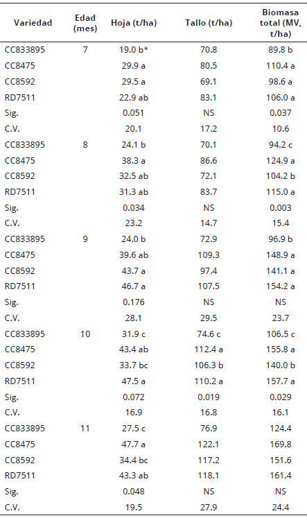 Las variedades de caña de azúcar estudiadas se caracterizaron por producir buena cantidad de tallos y hojas en los periodos de evaluación. La producción promedio de tallos aumentó de 76 t/ ha a la edad de 7 meses hasta 109 t/ha a los 11 meses. No obstante, a los 10 meses de edad las variedades CC8475 y la RD7511 produjeron más biomasa (P < 0.05) que las variedades CC8592 y CC833895. La proporción de hojas de las variedades varió entre 25 y 29% y fue más alta en las variedades CC8475 y RD7511 pasando de 25 t/ha a los 7 meses a 39 t/ha a los 9 meses de edad (Tabla 3). La producción total de biomasa (hoja + tallo) a los 7 meses de edad de cultivo fue más alta (P < 0.05) en las variedades CC8475 (110 t/ha) y RD7511 (106 t/ha), no obstante, esta diferencia desapareció a los 11 meses de edad, con un promedio de 152 t/ha.