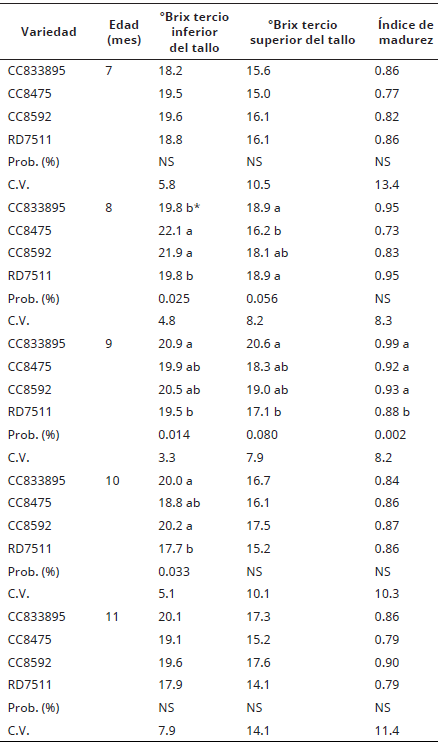 A los 7 meses de edad de cultivo la concentración promedio de azúcar en las variedades fue de 19 °brix en la base del tallo y de 15.7 °brix en la parte superior, con alta concentración (22 °brix) a los 8 meses. Al comienzo de la época de lluvias (abril), que coincidió con el noveno mes después de la siembra, las variedades Cenicaña presentaron una concentración de azúcar (20 °brix) con una mejor distribución a lo largo del tallo, con un índice de cosecha entre 0.99 y 0.92. Durante los meses lluviosos de mayo y junio, cuando la caña tenía una edad de 10 y 11 meses, respectivamente, la concentración de azúcar en la base del tallo permaneció estable en 19 °brix, sin embargo, en la parte superior del tallo los grados brix se redujeron a 16, con un índice de madurez de 0.83, cercano al valor que presentó la caña de azúcar a la edad de 7 meses (Tabla 4).