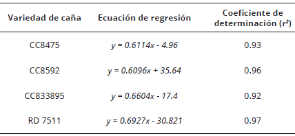 La concentración de azucares mediante los sólidos totales (°brix) presentes en el jugo de la caña se determinó con un refractómetro digital Pal-1, en el cuarto entrenudo hacia arriba desde la base del tallo y en el cuarto entrenudo hacia abajo desde la parte apical. El índice de madurez se obtuvo relacionando los grados brix de la parte apical con los grados brix de la base del tallo (Ramírez et al., 2014). Este índice fue tomado como base para determinar cuándo la planta estaba en condiciones óptimas de madurez para cosecha, que de acuerdo con Oliva et al. (2017) y Mequanent (2016) debe ser de 0.95. El área foliar fue medida a 8 meses de edad del cultivo en todas las hojas de 10 tallos de cada variedad. Esta medición se realizó por dos métodos: con un planímetro Cl -203 CA- CID Inc. y midiendo el área como producto del largo x el ancho. Los pares de datos resultantes para cada hoja se sometieron a un análisis de regresión para determinar la relación entre ellos, para lo cual se utilizó un modelo lineal simple, tomando como base varios estudios realizados en otras gramíneas como sorgo (Solórzano, 1976), caña de azúcar (Oliveira et al., 2007), maíz (Razquin et al., 2017) Brachiaria plantaginea (Bianco, 2005), y algunas gramíneas forrajeras tropicales (Sousa et al., 2015). El modelo propuesto fue: y = bo + b1X, donde y = área foliar, bo = intercepto, b1 = coeficiente de regresión, X = Largo * Ancho de la hoja.