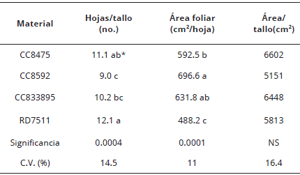Los resultados de área foliar en este estudio fueron similares a los encontrados por Oliveira et al. (2007) y Brito et al. (2007) y muestran la validez del producto ancho x largo de hoja para esta medición. La caña de azúcar es una planta C4 con alta capacidad para utilizar carbono en la fabricación de carbohidratos. Las variedades CC8475 y RD7511 presentaron, respectivamente, y 12 hojas/tallo lo que favorece una alta capacidad fotosintética. Aunque las demás variedades en estudio presentaron menor número de hojas, éstas tuvieron una mayor área foliar lo cual asegura su adecuada capacidad de fotosíntesis y un IAF de 3, inferior al encontrado en cultivos de caña de azúcar en el Valle del Cauca, donde el IAF varía entre ente 4 y 7 en cultivos de 8 meses de edad a cosecha (Amaya et al., 1995).