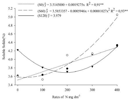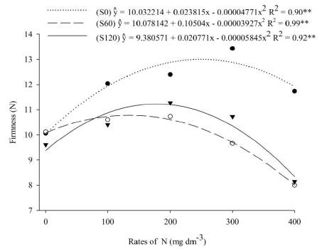 For firmness, the interaction between the rates of N and S (Figure 1) it was found that rates 0, 60 and 120 mg dm-3 of S were adjusted to the quadratic regression with the maximum points estimated at 13; 10; and 11N, respectively. Possibly the N contributed to greater firmness in the fruits until the optimum level, and then decrease was verified.