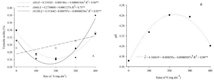 The titratable acidity in the tomato fruit presented a quadratic adjustment decreasing for rates 0 and 120 mg dm-3 of S, reaching a mínimum of 0.26 and 0.25%, corresponding to rates 203 and 168 mg dm-3 of N (Figure 3A). Regarding the rate 60 mg dm-3 of S had a linear adjustment as a function of increasing rates of N, reaching a maximum value of TA in the range of 0.32% corresponding to the rate of400 mg dm-3 of N. Values found in this study are considered low compared to the values reported by Tigist et al. (2013) and Mello et al. (2020). But, similar results to the present study were observed by Bérnard et al. (2009) and Kuscu et al. (2014) where they found a significant increase in the titratable acidity as a function of the applied N rates.