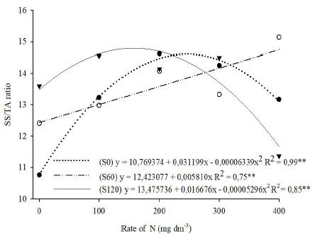 The SS/TA ratio in the tomato fruit pulp (Figure 4) shows that for the rates 0 and 120 mg dm-3 of S the data were adjusted to an increasing quadratic regression with the maximum point estimated at 246 and 157 mg dm-3, respectively, corresponding to a SS/TA ratio of 14.6 and 14.8 respectively. The rate of 60 mg dm-3 of S presented a SS/TA ratio of the order of 14.7. The values of the SS/TA ratio obtained in the present study are considered good, since they are above 10, according to what was stipulated by Kader et al. (1978). Schwarz et al. (2013) found values similar to those mentioned above, which allowed inferring that this relationship can be influenced by TA, since the reduction of these values, allowed the increase of this relation, as a function of the rates of N.