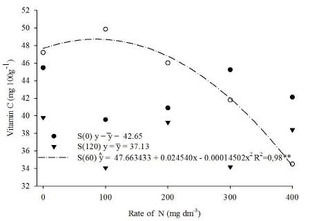 Vitamin C levels did not adjust to polynomial regression at rates of 0 and 120 mg dm-3 of S, thus presenting an overall mean of 42 and 37 mg 100g-1 of ascorbic acid, respectively, as a function of increasing rates of N (Figure 5). In relation to the rate of 60 mg dm-3 of S in this treatment, quadratic behavior was obtained as a function of N rates, with a maximum increase of 48 mg 100g-1 of ascorbic acid at the rate of 84 mg dm-3 of N, decreasing later. It may have been influenced by the N, since it interferes in the availability of its components, having a positive effect on vitamin C and some phenolic compounds in low applications, besides interfering in the availability of minerals. These results are in agreement with Bérnard et al. (2009) who observed a decrease in the vitamin C content due to an increase in the supply of N. Souza et al. (2010) evaluating the application of wastewater from pigs after filtration in the tomato, obtained vitamin C content ranging from 15 and 22 mg 100g-1. The vitamin C content found in this study was higher than the reported by Tigist et al. (2013).