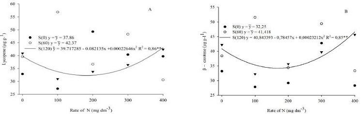 The interaction of N and S rates showed a concentration of P-carotene at rates 0 and 60 mg dm-3 of S, which had no polynomial adjustment, with a mean of 32 and 41 pg g-1, respectively (Figure 6B). On the other hand, the rate of 120 mg dm-3 of S was adjusted to the decreasing quadratic regression with the minimum point estimated at 32 pg g-1, corresponding to the rate of 181 mg dm-3 of N. It was observed both lycopene concentrations for the P-carotene concentration, the rates of 0 and 60 mg dm-3 did not influence the analysed variables, in contrast with a rate of 120 mg dm-3, which, due to the increasing rates of N, presented a reduction of 79% in the beta- carotene concentration.