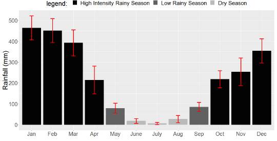 Two distinct seasonal periods were identified, according to accumulated monthly precipitation, with a 95% reliability. The year can be divided into a dry and a rainy season. The rainy season runs from September to May, with low rainfall