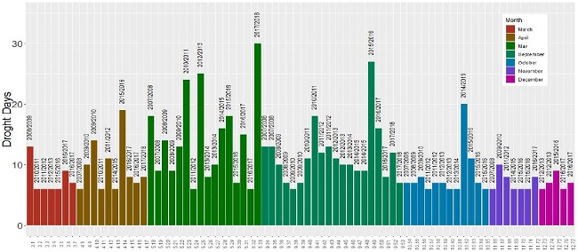 June, July and August were disregarded for constituting the dry season of the year. January and February had no drought events in any of the eleven years studied. Drought events occurred most often in the months that open the rainy season (20 drought events in September) and close (16 drought events in May). They are also more intense, often lasting more than 10 days and sometimes longer than 20 days. In March, April, October, November and December, shorter periods of drought predominate (Figure 4).