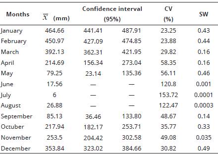 The empirical distribution of data adhered to the normal distribution by the Shapiro Wilk test (α = 5%) in almost all months of the year, except for the dry season months (Table 1). From this, some inferences were possible. In January, the average rainfall is not less than 441.41 mm in 95% of the years. The rainfall forecast for the other months of the year, considering a 95% confidence interval, is shown in Table 1.