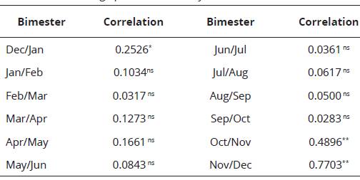 Through linear regression performed separately to each bimester, using bimonthly precipitation averages (e.g., Jan/Feb, mean of sixteen years), a significant correlation was observed for the following bimesters: October/November (r=0.49**), November/December (r= 0.77**) and December/ January (r = 0.25*) (Table 2). This result indicates that, between October and December, Pacific temper ature abnormalities in the Niño 1 + 2 region may significantly influence rainfall in Paranorte, during spring. This result agrees with the literature reported for other Brazilian regions. According to Berlato and Fontana (2019) spring and early summer (autumn, November and December) is one of the most influenced by ENSO phenomena in southern Brazil. Therefore, although anomalies in Pacific temperature influence regions differently, the rainfall regime seems more vulnerable to changes in the spring, in regions of high or low latitudes.