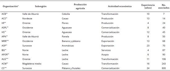 Con el propósito de considerar en el estudio la diversidad organizacional, cultural y productiva, se seleccionaron tres cooperativas y 10 asociaciones ubicadas en siete subregiones del Departamento de Antioquia en los municipios de: Belmira, Guadalupe, Santo Domingo, Maceo, San Vicente Ferrer, Rionegro, El Carmen de Vivoral, Caramanta, Andes, Girardota, Barbosa, Liborina y Cañasgordas; orientadas a diversos sistemas de producción (leche, plátano, aguacate, flores, frutales, cacao, cebolla y panela), como se indica en la Tabla 1.