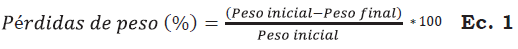 Las pérdidas de peso se determinaron midiendo cada 2 días el peso de cinco frutos por tratamiento de manera individual con una balanza digital ALSEP EY-2200; para la obtención de datos se aplicó la Ecuación 1. La firmeza se determinó con un texturómetro (Wagner Force Five modelo FDV- 30) con puntal cónico de 7 mm de diámetro; las medidas se realizaron cada 2 días en una muestra de cinco frutos por tratamiento. Los valores se reportaron en Newton (N).