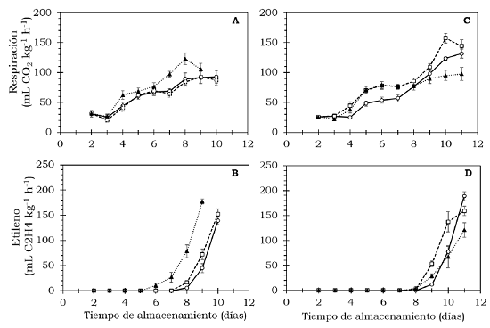 Se determinaron diariamente por cromatografía de gases de acuerdo con el método del espacio de cabeza (Tovar et al., 2011); para esto, de cada tratamiento se tomó una muestra al azar de ocho frutos, con los cuales se establecieron cuatro unidades experimentales (repeticiones) de dos frutos cada una, que fueron colocados en recipientes cerrados herméticamente de 2.12 l de capacidad durante 1 hora. Se tomó una muestra de 1 ml del gas del espacio de cabeza y se inyectó a un cromatógrafo de gases (Hewlett Packard, modelo 5890 serie II), con columna tipo abierta, empaque de capa porosa de sílica de gel que fue conectado simultáneamente a un detector de ionización de flama (FID) y a un detector de conductividad térmica (TCD). Las condiciones de operación fueron: temperatura de la columna 150 °C, FID 180 °C y TCD 180 °C; se utilizó un estándar de CO2 con 500 μl/l y de etileno con 20 μl/l, ambos de INFRA®. Los datos de respiración se reportaron como ml/l por hora de CO2 y la concentración de etileno en μl/kg por hora.
