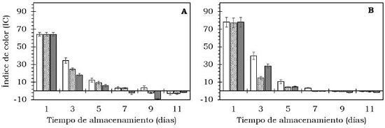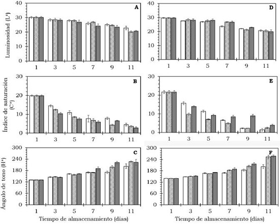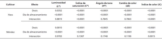 Se determinó de manera individual, en una muestra de cinco frutos por tratamiento, utilizando un colorímetro de reflexión HunterLab (Reston Virginia modelo D25-PC2) con un sistema de iluminación D65 y un ángulo de observador de 2°. Con los valores obtenidos (L*, a* y b*) se calculó la luminosidad (L*), el Índice de saturación o croma (C*), el ángulo de tono o hue (H*), el cambio de color y el índice de color (IC) de acuerdo con las Ecuaciones 2, 3, 4 y 5 (Henao-Rojas y Rodríguez, 2016; Medina- Torres et al., 2017; Wrolstad y Smith, 2017).