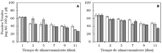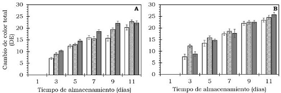 Para la extracción de clorofila (a, b y total) se empleó 1 g de pulpa a la cual se le agregaron 10 ml de acetona-agua (8:2 v/v), se maceró y dejó reposar por 24 h en oscuridad a 4 °C. La determinación se realizó siguiendo la metodología de Pompelli et al. (2013), para lo cual se emplearon 3 ml del extracto y se tomaron las lecturas de la OD a 645 y 663 nm, los resultados se reportaron como μg de clorofila a, b y total/g de pulpa fresca. La extracción de carotenoides totales se hizo a partir del método propuesto por Acacio-Chirino et al. (2013) con algunas modificaciones, a 10 g de pulpa se le agregaron 20 ml de acetona, se maceró, agitó y decantó. Se agregó acetona hasta extraer completamente los pigmentos. Luego, al extracto le fueron adicionados 20 ml de éter de petróleo y 20 ml de agua destilada, se mezcló en forma suave y se dejó reposar por 10 min, transcurrido este tiempo se desechó la capa inferior y se repitió el proceso dos veces más. Una vez obtenido el extracto libre de acetona, se adicionaron 10 ml de hidróxido de sodio-agua (4:6 p/v) para saponificar la muestra. Finalmente, se hizo un lavado con 10 ml de Na2SO4 anhidro-agua (1:9 p/v) y se realizó la lectura a 454 nm. Los resultados se expresaron como μg de β-caroteno/g en pulpa fresca. La extracción y cuantificación de clorofila y carotenoides se realizó después de 11 días de almacenamiento a 20 °C.