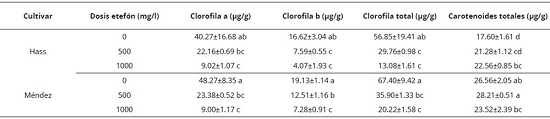 En los contenidos de clorofila se presentaron diferencias (P < 0.05) por efecto del cultivar y la dosis de etefón (Tabla 3). En ambos cultivares, en el tratamiento ocurrió el mayor contenido de clorofila total en estado de madurez de consumo. De igual forma, la concentración de carotenoides totales varió (P < 0.05) por efecto del cultivar y la dosis de etefón aplicada para inducir maduración; sin embargo, la pulpa de los frutos del cv. Méndez presentaron mayor contenido de carotenoides totales en comparación con el cv. Hass. Con el tratamiento 500 mg/l en el cv. Méndez ocurrió la mayor retención de este pigmento en el estado de madurez de consumo (28.21 ± 0.51 μg/g). Asimismo, se observó que la dosis de etefón favoreció la presencia de carotenoides (Tabla 3). Asociado con los cambios en color de la pulpa de tonalidad verde-amarillo a amarillo durante la maduración, el menor contenido de clorofilas (a, b y total) y mayor concentración de carotenoides, resulta significativamente importante en cuanto a la tonalidad de la pulpa con fines de consumo en fresco y procesamiento (Vergara-Domínguez et al., 2016). Cox et al. (2004) y Ashton et al. (2006) encontraron una reducción en la concentración de clorofilas en frutos de aguacate cv. Hass por efecto del proceso de maduración, tal como ocurrió en el presente estudio (Tabla 3). Lu et al. (2009) encontraron diferencias en los contenidos de carotenoides en pulpa de aguacate cv. Hass en estado de madurez de consumo por efecto de condiciones de desarrollo y época de cosecha, con variaciones desde 5 μg/g hasta 40 μg/g en carotenoides totales. Los valores encontrados en el presente trabajo varían entre 17 y 28 μg/g, lo cual permite asumir que el cultivar, el contenido de materia seca en cosecha y el manejo poscosecha también influyen en el contenido de estos pigmentos. Con respecto a estos pigmentos, el tratamiento con 500 mg/l favoreció una mayor acumulación que resulta importante por los beneficios que otorgan a la salud humana, por su capacidad antioxidante y la conservación de la funcionalidad de la pulpa de aguacate.