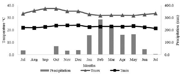 The climate of the region corresponds to the Aw (rain tropical) type, according to the Koppen classification, with dry winters and rainy summers. Precipitation is concentrated between December and June (Figure 1).
