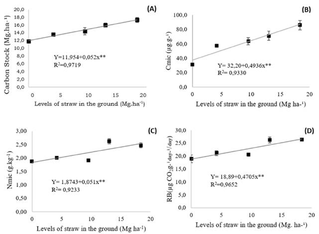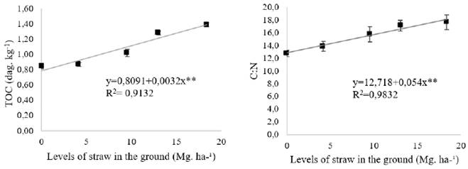 Wendling et al. (2011) observed in areas of the Cerrado of Minas Gerais, Brazil, values for C:N ratio that ranged from 13.2 to 15.4 at 0-10 cm depth. According to the same authors, these values are considered low and may contribute to soil microbial activity and accelerated decomposition of material and incorporation to soil. Deposition of straw in soil promoted the increase of carbon stocks that presented higher values (P < 0.01) in the treatments with 13, 04 and 18.38 Mg. ha-1 of straw (Figure 3-A).