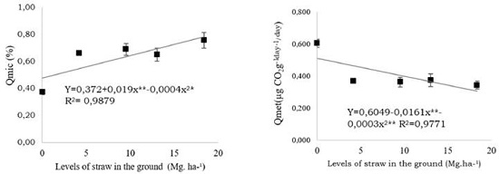 For microbial respiration, it was observed that treatments with 13.04 Mg.ha-1 and 18.38 Mg.ha-1 of straw had higher values in relation to other treatments (P <0.01) (Figure 3-D). This indicator of a greater soil microbiological activity responds to a higher amount of straw deposited. Cmic/ TOC ratio values in all treatments and depths were low and presented significant differences among them (P < 0.01), showing an increasing trend (Figure 4-A). For the metabolic quotient, there was an effect of soil straw levels, showing a decreasing trend (Figure 4-B).