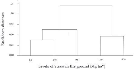 An Euclidean distance of 0.5 favoured the division into groups, indicating that using the variables mentioned above it is possible to sort the data into three distinct groups: the group formed by treatment 0 and 4.19 Mg.ha-1 of straw in the soil, the group formed by treatment 9.54 Mg.ha-1 of straw in the soil and the group formed by the treatments 13.04 and 18.38 Mg.ha-1 of straw in the soil.