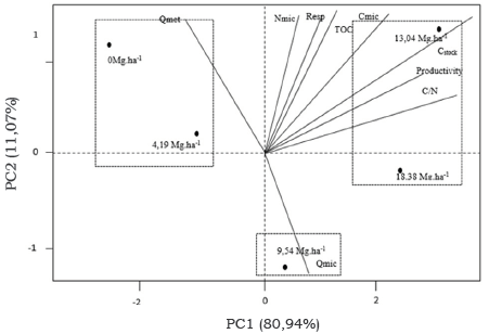 It was observed that the treatment 0 Mg.ha-1 of straw formed a group with the treatment 4.14 Mg.ha-1 of straw and was positioned in the upper left quadrant, that is, opposite to the arrangement of the variables assessed (Figure 6). The variables that most correlates with this group were metabolic quotient, total nitrogen content and nitrogen stock.