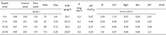 The soil of the study area was classified as a sandy texture clay loam soil (EMBRAPA, 2006). Soil particle size and chemical characteristics of the experimental area in the 0-40 cm layer are shown in Table 1.