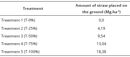 The experiment was installed in September 2009, repeated in 2010, 2011 and 2012. For this report the experiment was installed in July 2013, with a four years crop and third punch area, harvested without burning of sugarcane variety SP 81-3250. Plants were distributed 1.4 m between rows, where each experimental plot had dimensions of10 m wide and 15 m long, for a total of 150 m2, composed by 10 planting lines, with the floor area formed by the five central lines of each plot. For soil correction, 500 kg ha-1 of dolomitic limestone was applied. The fertilization used was 25, 150 and 75 kg ha-1 of N, P2O5 and K2O, respectively. After harvesting, 40 kg.ha-1 of N (urea) was applied. The trial was developed in a randomized block design with five treatments and four replications. Evaluated treatments consisted of five levels of straw. After harvesting all remaining straw within the experimental plots was weighed and placed in each plot according to the amounts determined for each treatment (Table 2).