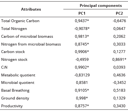 The evaluations of the variables related to the attributes and considering the 0-10 cm layer, resulted in a data set that was submitted to the analysis of variance. Means were compared by the Tukey test using the SAS 9.0 statistical program. Soil microbiological variables, treatments and productivity data were submitted to multivariate analysis by cluster analysis using the mean distance between groups (Euclidean distance) method and principal component analysis (PCA) using the SAS 9.0 statistical program.