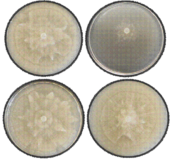 De los 120 aislados evaluados, 119 presentaron patrones de crecimiento estrellados con ligeras variaciones; micelio aéreo algodonoso y abundante hacia el centro de las colonias (Figura 1A, C y D). La cepa CH6-3S presentó un patrón diferente, radiado con poca producción de micelio (Figura 1B). Todos los aislados fueron similares en términos de crecimiento y al cuarto día la mayoría había cubierto completamente la caja.