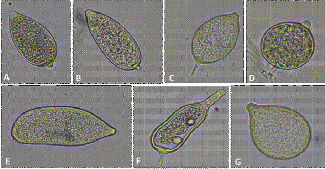 Se observó alta variabilidad en la forma y el tamaño de los esporangios entre aislados y dentro de un mismo aislado. En relación con la forma de los esporangios, se identificaron ocho morfotipos (Figura 2). El 96 % de los aislados presentaron tres o más de estas formas: todos presentaron esporangios ovoides y elipsoides, siendo los primeros los más abundantes. La cepa CH6-3S produjo esporangios globosos principalmente y las cepas TM2-2S, TM2-2T, TM2-3M, TM2-3S, CH3-2M, MA2-5M y CA4-2M produjeron esporangios elipsoides principalmente.
