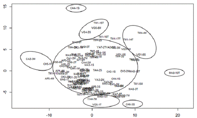 El Análisis de Escalamiento Multidimensional mostró que el 83 % de los aislados de Phytophthora spp. analizados conforman un grupo y esto indica una alta similitud en relación con sus atributos morfológicos, independientemente de su procedencia. El 17 % restante conforman grupos más pequeños que difieren significativamente del grupo principal en al menos un caracter. Los aislados CH6-3S y MA9-10T presentan esporangios y clamidosporas más pequeños que el resto de los aislados, pero estos a su vez, difieren entre sí, en la relación largo/ancho de los esporangios. Los aislados CA4-1S CH5-1T y CA2-3M presentan esporangios más grandes que el resto y difieren entre sí por el tamaño de sus clamidosporas (Tabla 3). El grupo formado por los aislados TM4-4M, VG1-6S y TM1-14T presenta esporangios más pequeños, pero con papilas más grandes que la mayoría de los aislados, y el grupo formado por los aislados VG5-1T, YA4-7M y MA6-10T presenta esporangios más pequeños y una relación largo/ancho en los esporangios, menor que la mayoría de los aislados (Figura 4).
