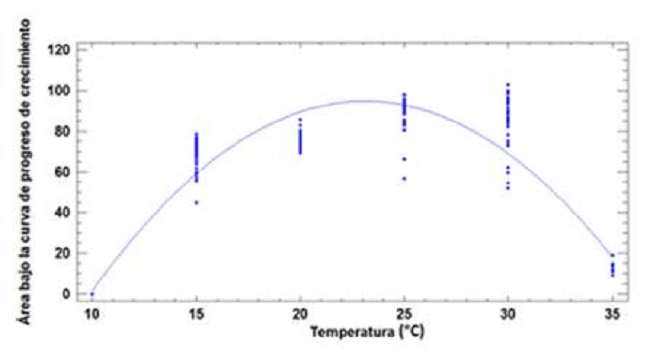Para el estudio de las temperaturas cardinales se ajustó un modelo polinomial de segundo orden que describe en un 89 %, la relación entre crecimiento y temperatura. La ecuación del modelo ajustado es
