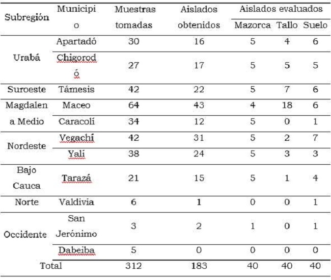 Se procesaron 312 muestras, de las cuales se obtuvieron 183 aislados. En 82 % de los predios visitados se confirmó la presencia de Phytophthora spp. Un mayor porcentaje de aislados se obtuvo de muestras de los municipios de Maceo y Vegachí, 43 y 31 aislados, respectivamente. En San Jerónimo y Valdivia solo se obtuvieron dos y uno, respectivamente, en Dabeiba no se obtuvo ninguno. El Magdalena medio y el Nordeste antioqueño fueron las regiones con mayor presencia del oomiceto, con 98 y 80 aislados respectivamente, seguidas por el Urabá y el Suroeste, con 57 y 42 aislados respectivamente. El Bajo Cauca, el Norte y el Occidente fueron las regiones con menor presencia de Phytophthora spp., con 21, 6 y 3 aislados respectivamente (Tabla 1).