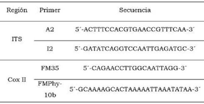 La identificación molecular a nivel de género se realizó con la técnica de PCR convencional, amplificando la región de los espaciadores internos transcritos (ITS) y la región del gen mitocondrial citocromo oxidasa II (Cox II) (Tabla 2).