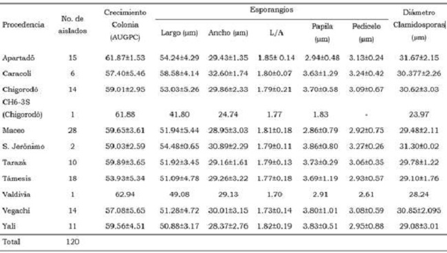 Se prepararon suspensiones acuosas a partir de los cultivos crecidos por siete días en medio AZ a 25 °C en condiciones de oscuridad. De cada aislado se evaluaron 40 esporangios y se consideraron la forma, la caducidad, el tamaño (largo y ancho), la longitud de la papila y la longitud del pedicelo. Inicialmente se garantizó que los cultivos estuvierann en crecimiento por siete días en el medio Agar zanahoria. Este es un factor importante, ya que la edad y el tipo de cultivo donde se siembran los aislados, están directamente relacionados con la caducidad de los esporangios. Estos solo se desprenden al alcanzar la madurez y las longitudes de pedicelo son uniformes una vez se separan del esporangióforo. Otro factor que se tuvo en cuenta, es que al momento de preparar las suspensiones en agua, el micelio se desprendió suavemente del agar para evitar romper los esporangios.